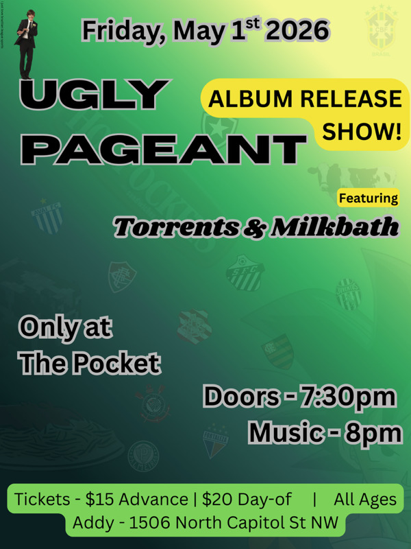 Ugly Pageant is a band from Langley Park, Maryland that plays garage rock revival revival music. When they're not playing music, the band members are all diehard supporters of Brazilian league sports. They are known widely for their sensitive, intelligible lyrics, and wry, engaging stage banter. If you're reading this, the cold calls worked, and they're finally playing a venue with a liquor license.